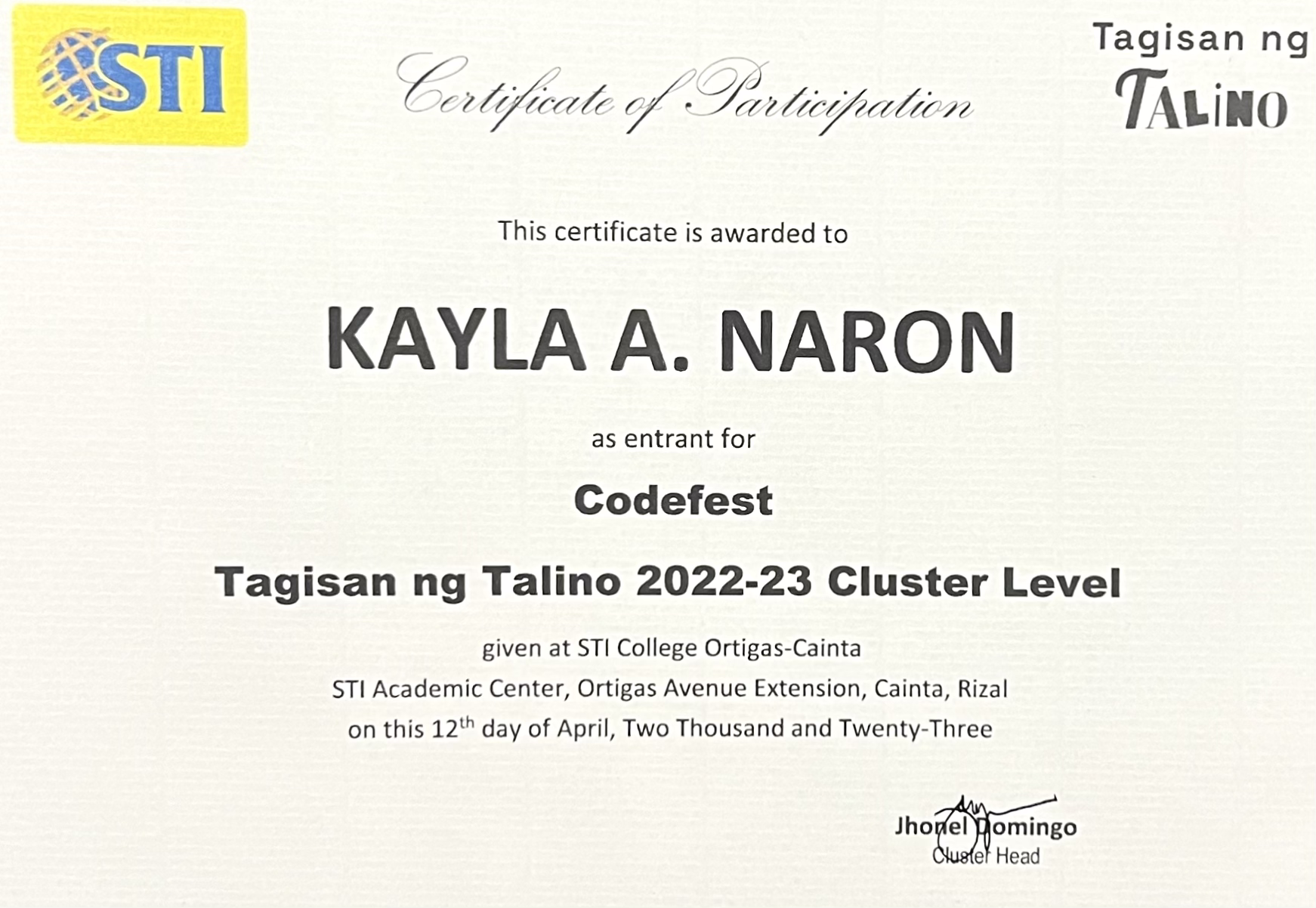 View CertificateParticipant – Codefest Cluster Level 2023